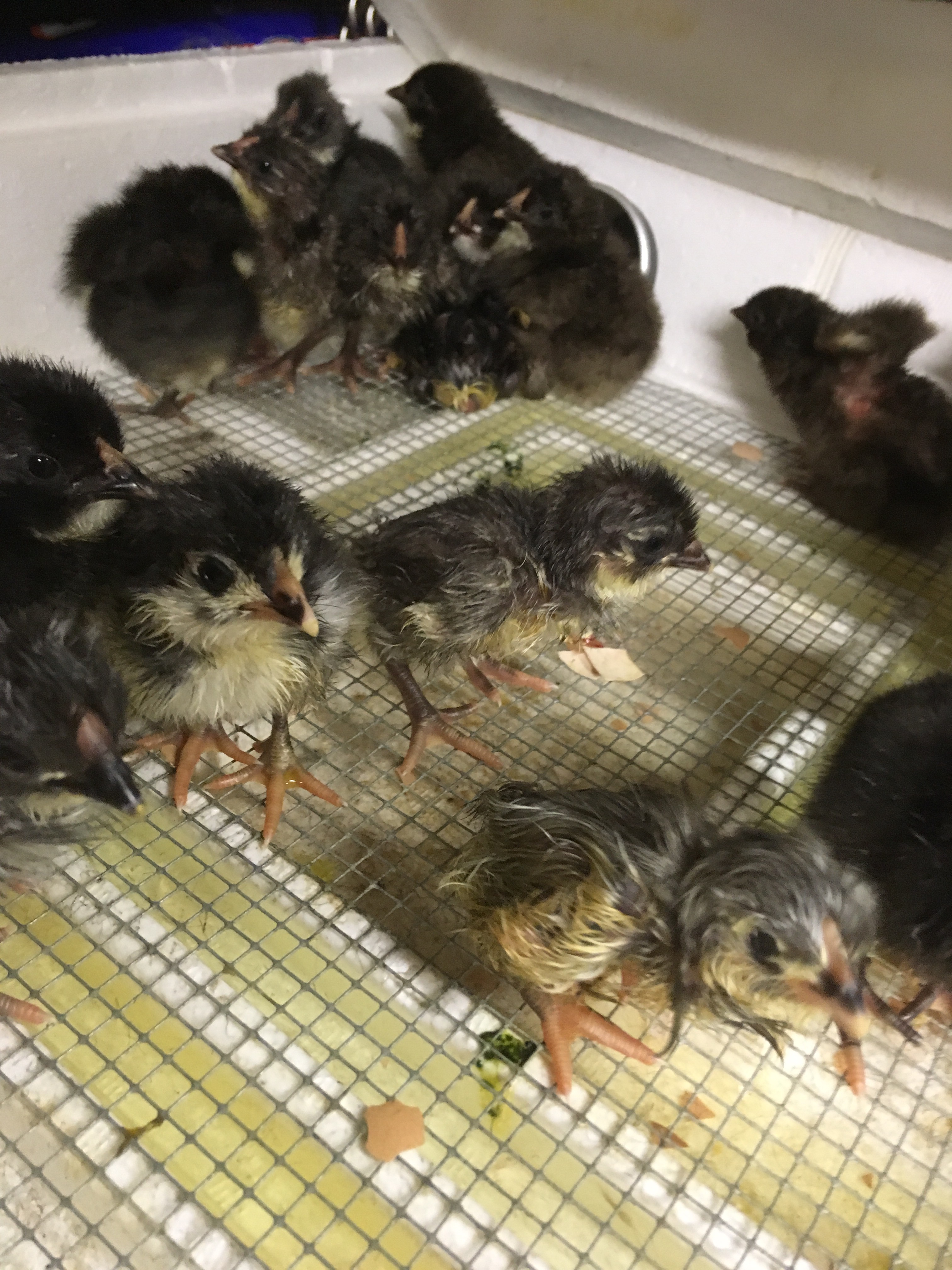 After those initial two early bird chicks I woke up on hatch day to five more chicks in the incubator. They continued to hatch through the day until the last one hatched about 10:30pm.